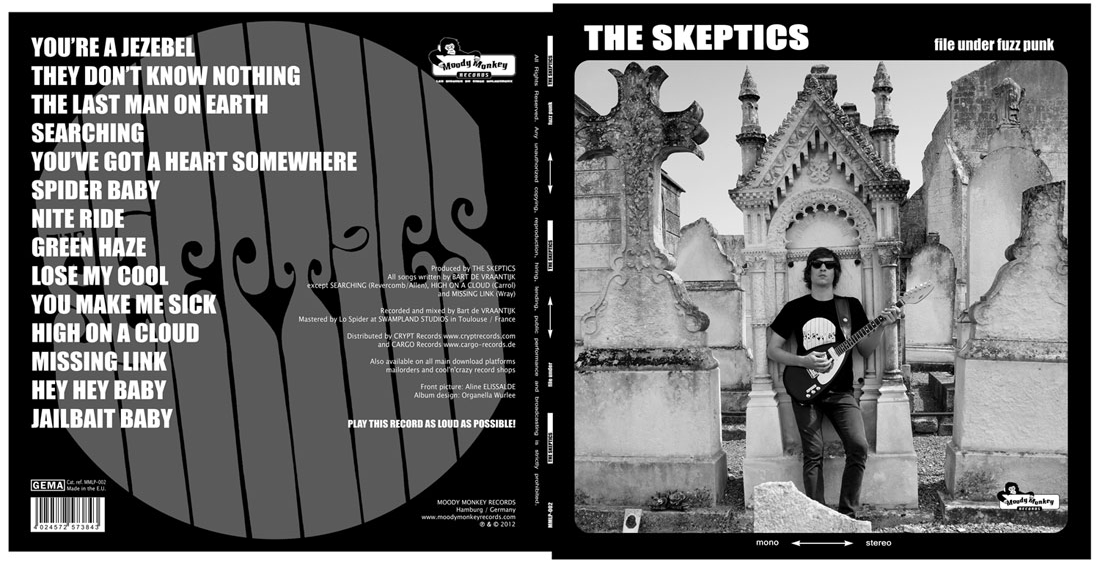 This album by THE SKEPTICS is soon gonna be a classic for all garage freaks interested in NOW! music, and will do pretty well too on any turntable. The album features two cover songs (an a**kicking version of "Searching" and "High on a Cloud") as well as a medley tribute to Link Wray. All other songs are written by Bart De Vraantijk. Cryptic fuzz punk meets 60s influenced garage weirdos: no clichés, just super original super raw garage tunes. THE SKEPTICS are a unique one-man creation interpreted live by a French-Belgian three-piece combo. So altogether 14 extremely exciting killers on vinyl, to be filed under Fuzz Punk!